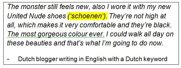 If you are going to be talking predominantly about local events, products, etc. then there is no point writing in English. For example the blogger below was clearly approached by a company to target their Dutch keyword (highlighted in yellow). This Dutch word (which carries the link) comes out of nowhere, is completely unrelated to the English content surrounding it, and just looks very spammy.